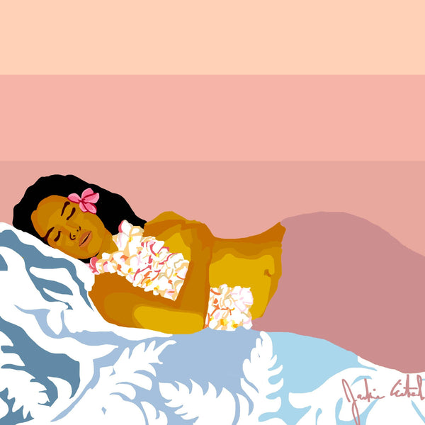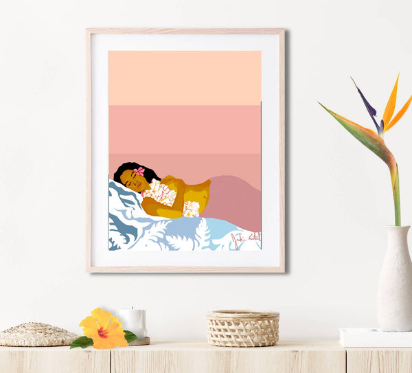 Original Art of Wahine dreaming of surfing. Artwork comes matted in selected size Print comes Matted with backboard and in a plastic sleeve.