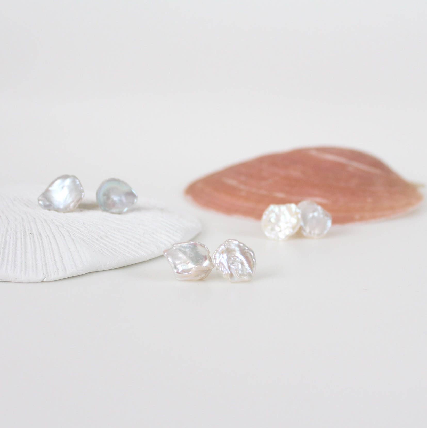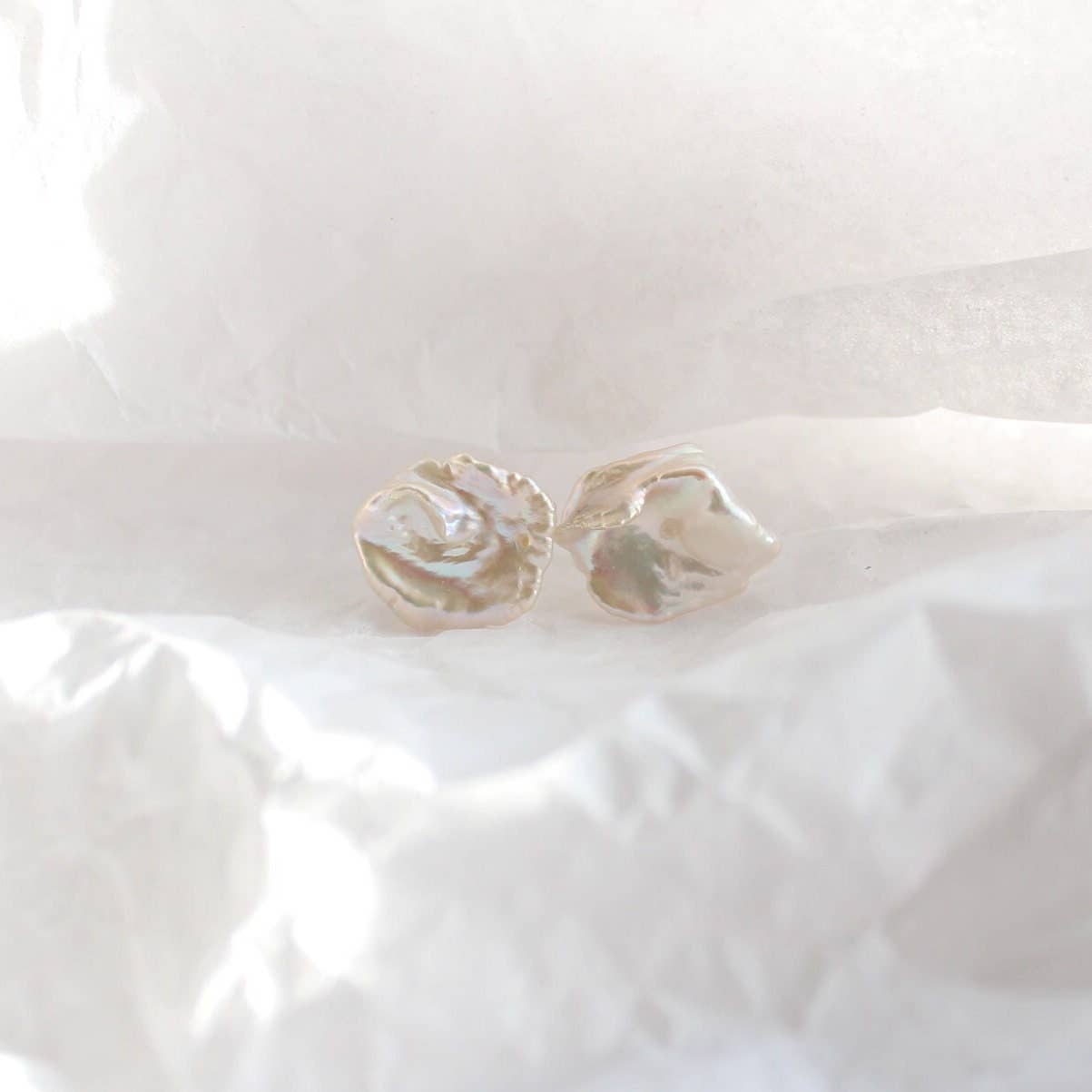 Dainty Flower Petal Keshi Pearl Earrings Handcrafted with genuine freshwater keshi pearls, each earring features genuine freshwater keshi pearls renowned for their unique flower petal shape. These Keshi pearls come with irregularity and natural beauty, the flower petal shape of the keshi pearls sets these earrings apart, making each pair of earrings truly one-of-a-kind. Detail: Pearl Type: Genuine freshwater white Keshi pearls Pearl Shape: Irregular flower petal Pearl Size: 12-15mm in diameter (Approx.) Materials: gold plating posts, and safety silicone stoppers. Handcrafted: Each piece is made with precision and care and handmade in Canada Please be aware freshwater pearls are cultured and formed through a natural biomineralization process, which means slight imperfections, surface textures, and organic shapes are part of their unique beauty and charm. Some minor flaws on pearls are not likely to be visible while they are worn, and won't hurt their value either. Shipping & Packaging: - Each item has a