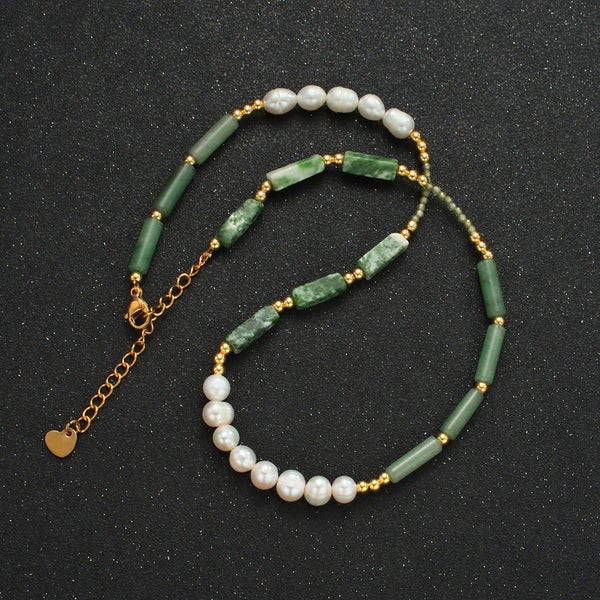 Handmade Green Jade Bead Chain Necklace with Freshwater Pearl 15.55 Inch with Extender | WA2584