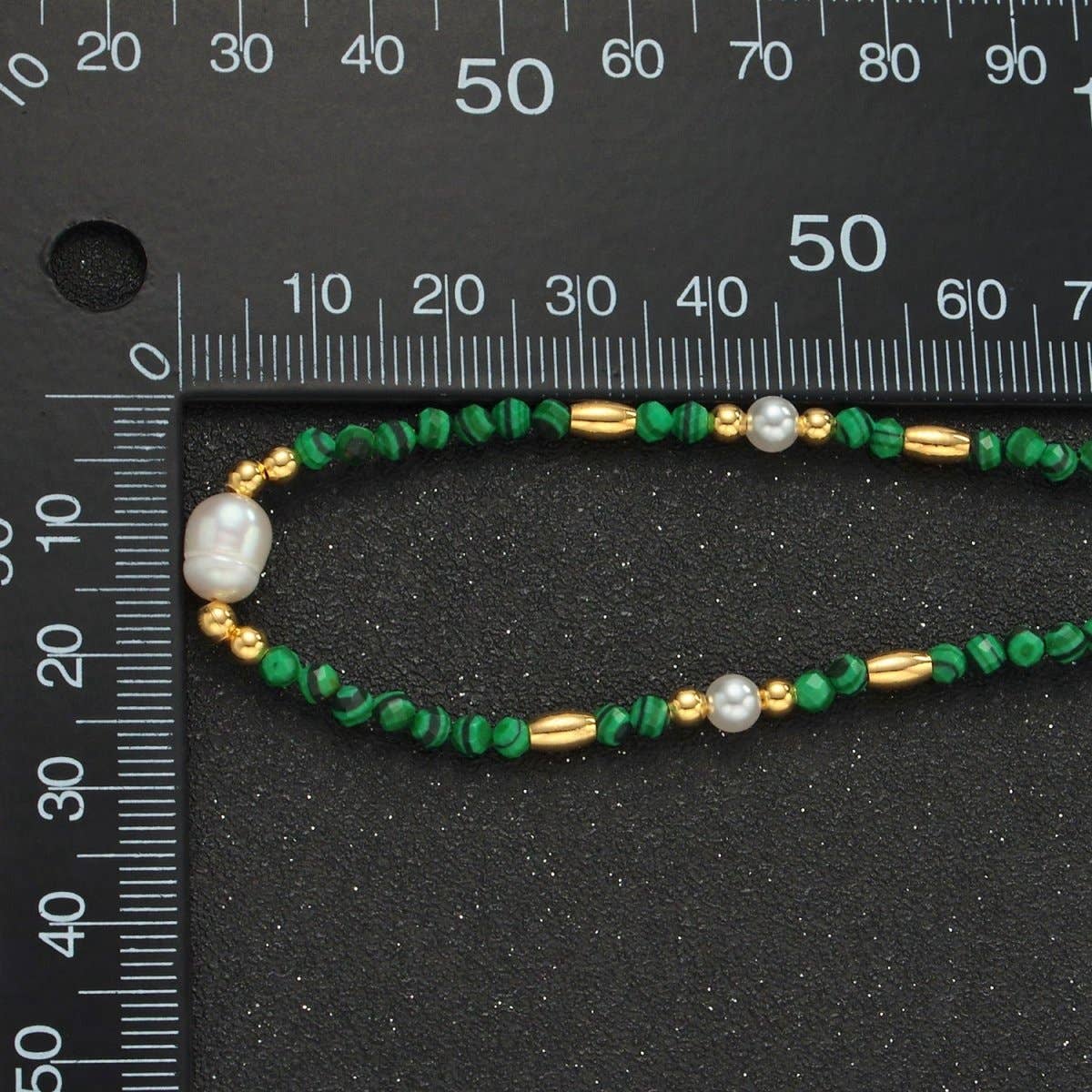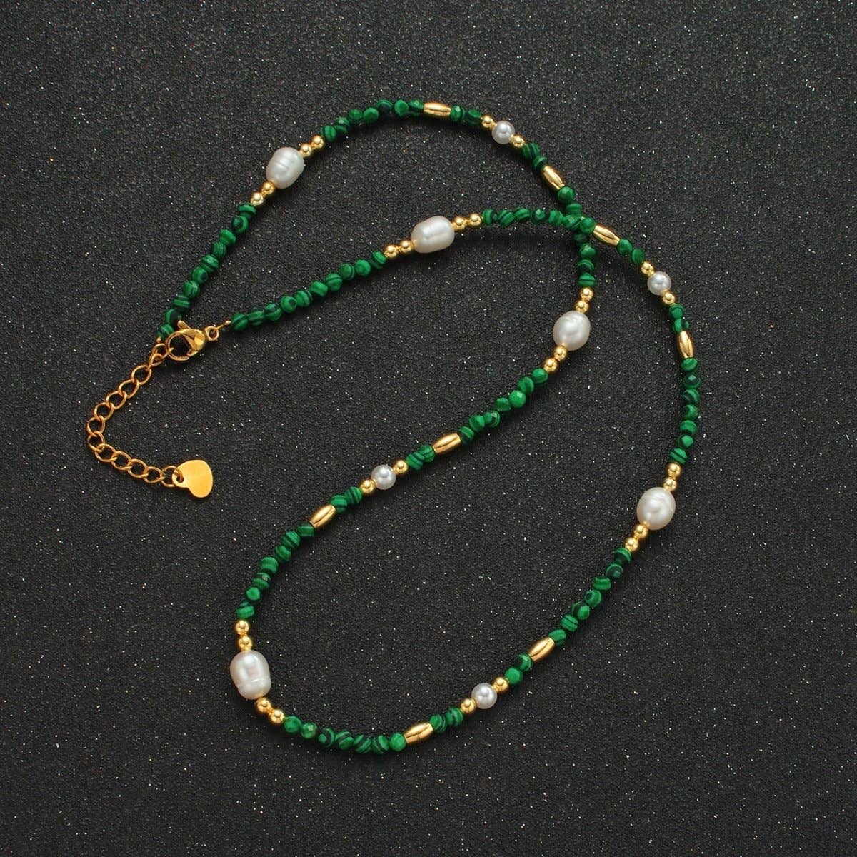 Handmade Green Malachite Beaded Chain Necklace with Freshwater Pearl 17.91 Inch with Extender | WA-A2587