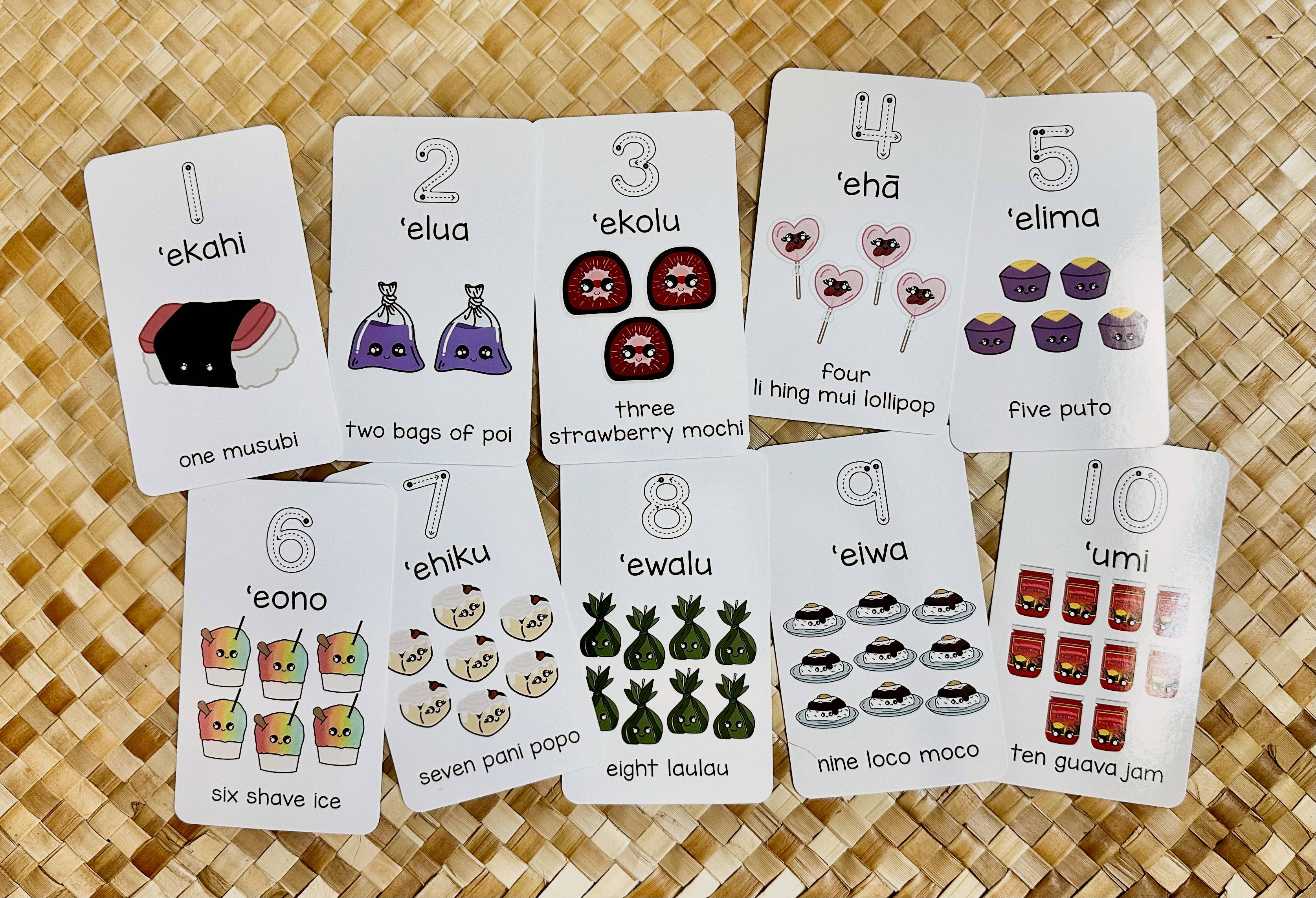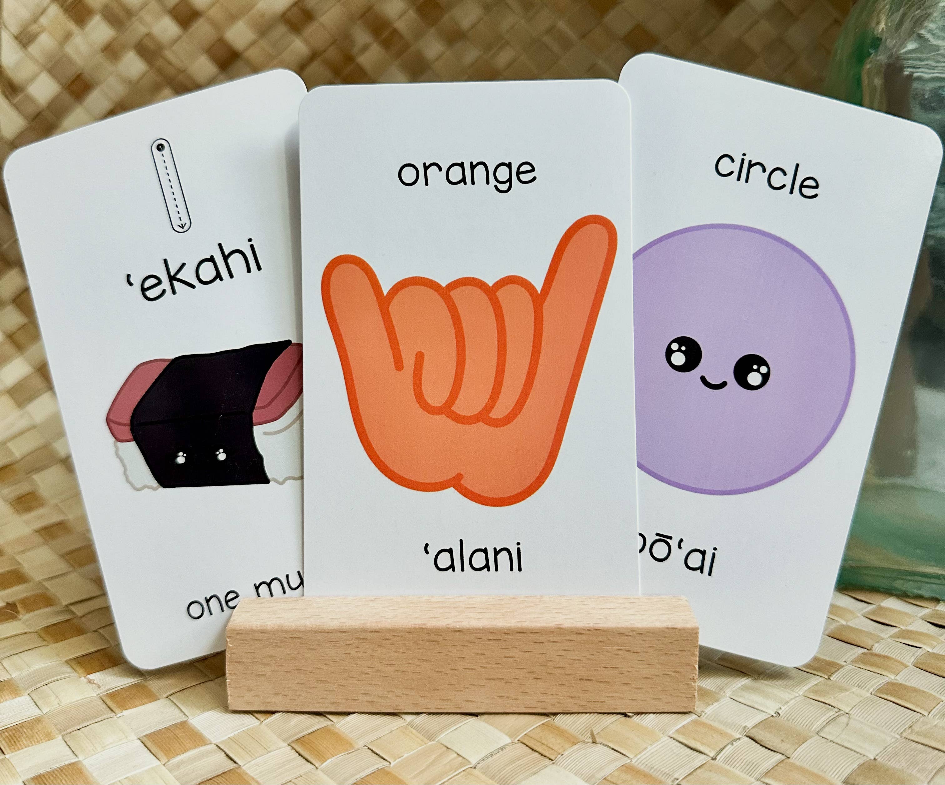 Teach your keiki (child) colors, shapes and numbers with these local Hawaiʻi themed flash cards! Each card includes an originally designed illustration along with words in both English and ʻŌlelo Hawaiʻi (Hawaiian Language)! These flash cards measure to be 3”x5” professionally printed on UV coated card stock. Each set includes 29 flash cards and comes with a convenient hand-stamped canvas drawstring bag for safekeeping.